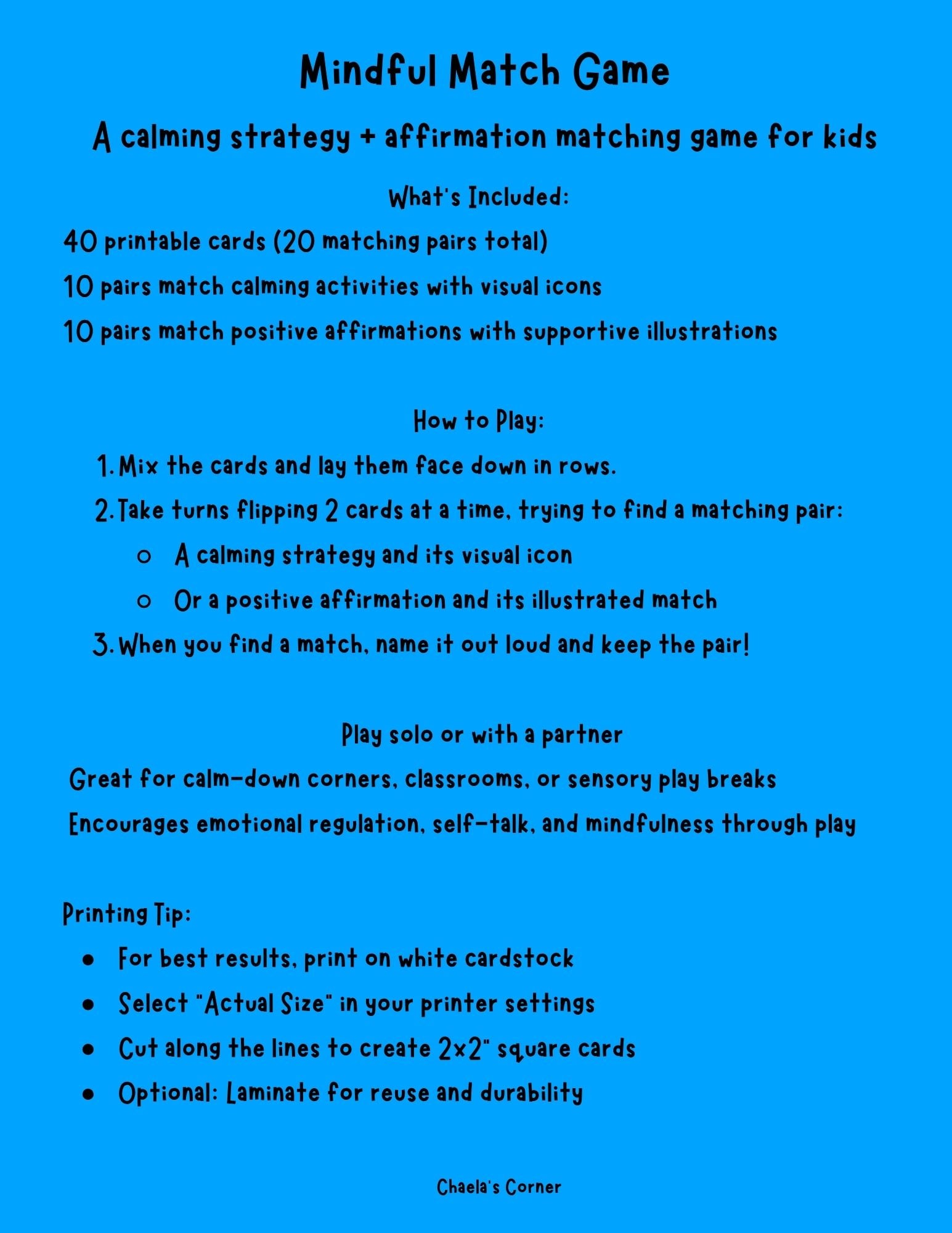Mindful Match Game - Printable Calming Strategy & Affirmation Cards for Kids (40 matching cards)